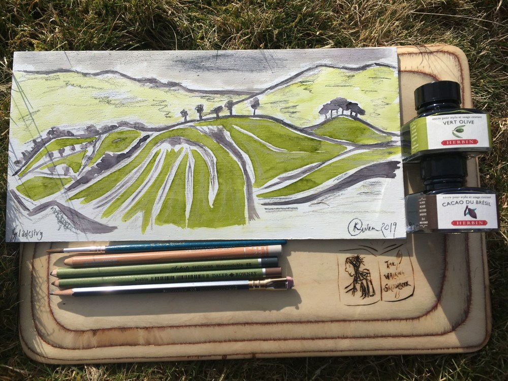 With the sunshine out and new #jherbin inks arrived, I was itching to take them onto Hergest Ridge to explore sketching with these new gorgeous colours. A few weeks ago Josephine Birch (Artist), pulled out a bottle of Cacao du Bresil from her bag. As soon as I saw it in her sketchbook I had to have a go. I paired it with some Vert Olive green. With me, I also had my usual kit wrapped up in my Pegandawl mini art roll, and also some acrylics. I had primed a wooden board the night before and without considering the permanence of the ink on the board, I naturally went for the inks and sketched the landscape, like I had always been using them.