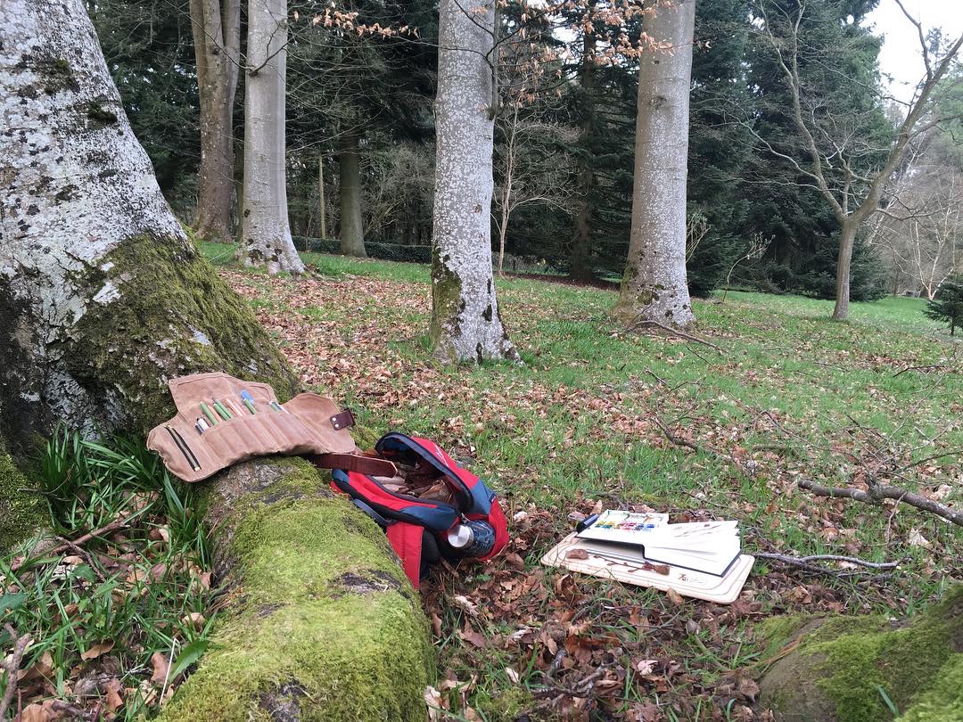 On my wander today, I came across the perfect place to sketch, on the root of a Beech tree covered in moss. Earlier, I had been thinking about those who might prefer to sketch the things they discover on their walks, the little things. So today was about noticing the little things.