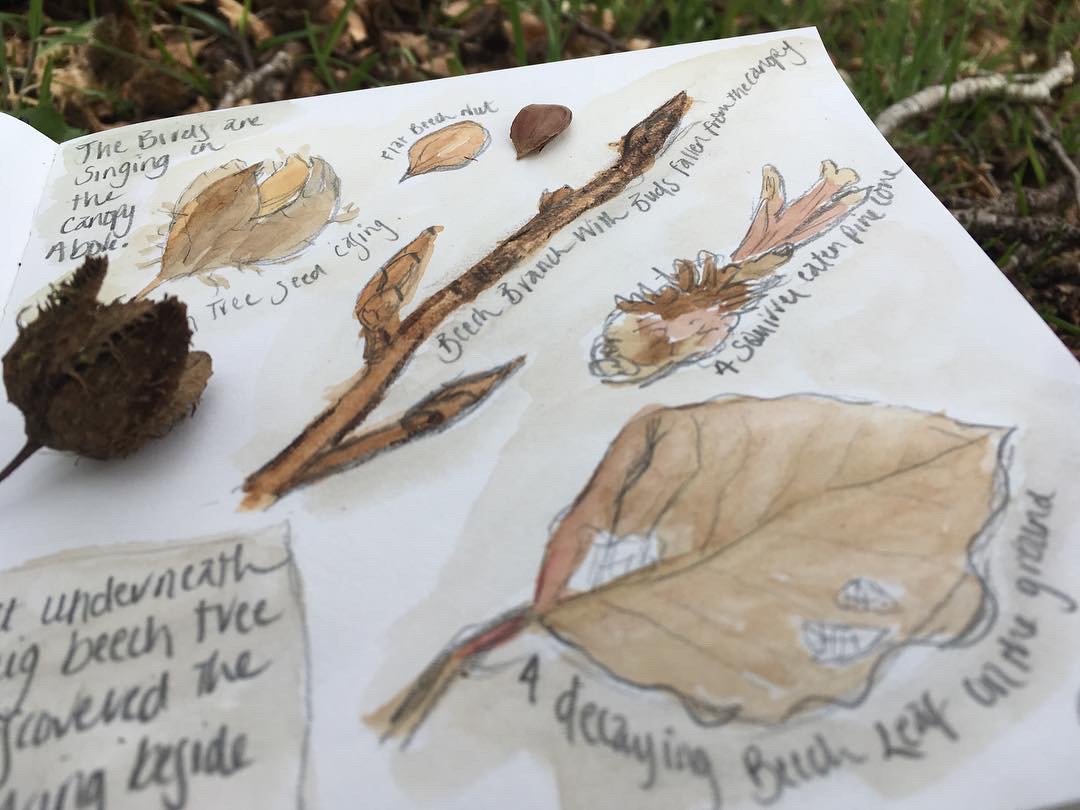 First into the hand was the beech nut casing which was open and an interesting shape to draw. Next, I discovered a small Beech nut which had not matured properly. Recently a twig had fallen down with the buds waiting to uncurl. The buds of the beech tree were long and thin. Someone years ago said to me that beech tree buds look like panama cigars, it’s always stuck in my mind. I find little bits of information always help me to remember tree identification. I do the same with flowers with snippets of folklore.
