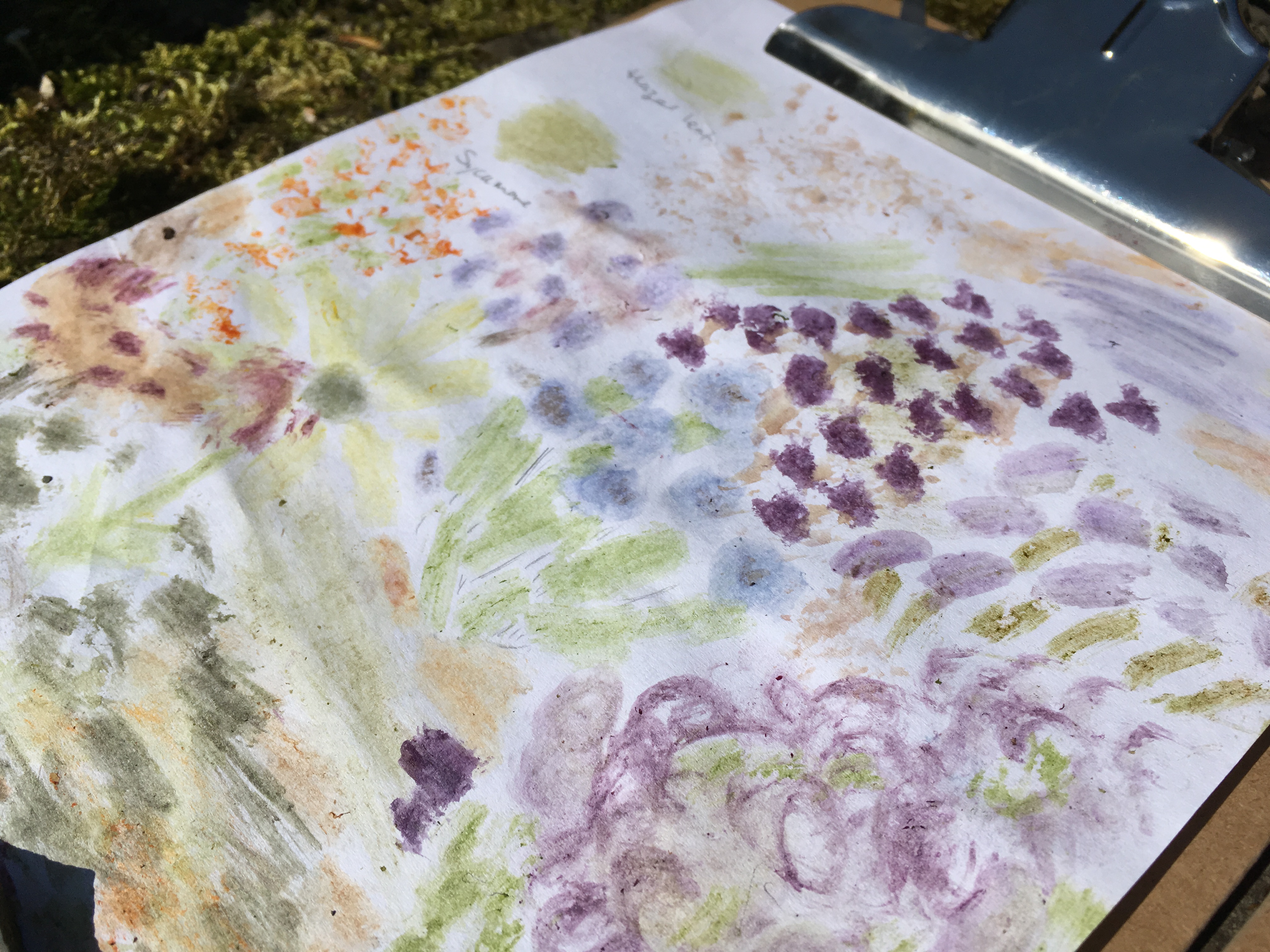 Our aim today was to connect with nature around us, learn the plant names and capture the colours from the plants themselves. We learnt to collect responsibly and safely, always being mindful of what we are collecting. The birds were singing as we walked through the gardens and into the Woodland.