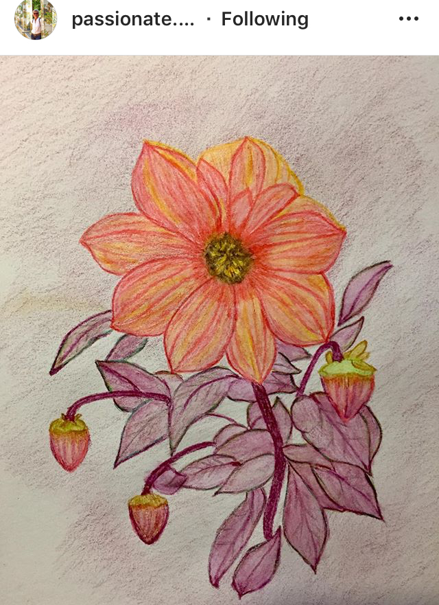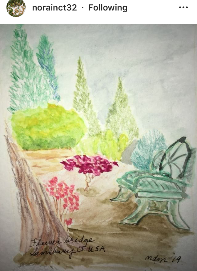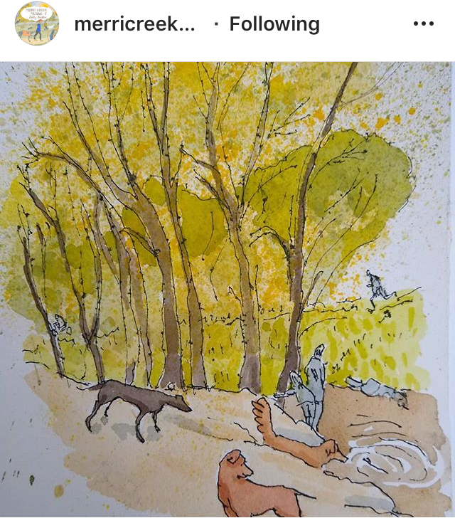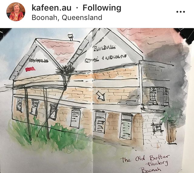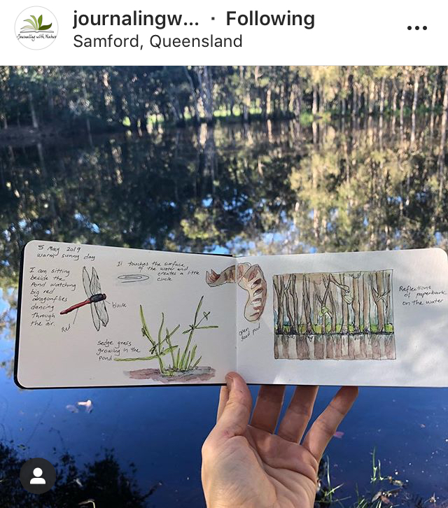 From here we ventured to the other side of the world to Australia where Polly Barstow from Melbourne took us for a walk in the rain with her dog and captured her view of the park. She showed us that whatever the weather it’s possible to have a go. Amanda Thompson in Queensland had better Autumn weather and on our walk here we saw a bottlebrush branch and heard wind in the distant trees and a hidden frog making some noises, all sounds helping us to connect with this nature sketching experience. @journalingwithnature took us out to a local pond to sketch what she could see, the dragonfly touching down on the water and the paperbark birch trees reflecting in the water. Kafeen from Queensland then took us for a walk around her local area and she captured one of the old buildings, creating a sense of place in time. South of Sydney, Colleen Reagon took us into her garden, where the dahlia’s were still blooming longer than expected, due to the longer season as they move into winter.