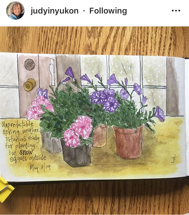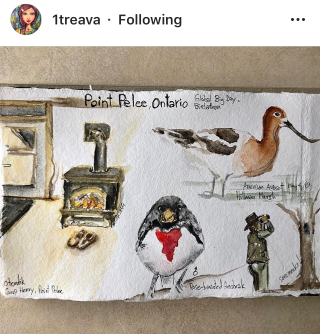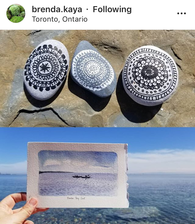 Heading North we ventured to Canada where the first spring flowers were being discovered by @sschaedel and trying out sketching outside. @treava1 went to Point Pelee, where so many nature connection adventures were had. We had a serendipitous moment when @brenda.kaya had sketched and doodled on stones on the same day last year! Connecting with water and the stones before you. A snow blizzard up in the Yukon prevented @judyinyukon from getting out, so sketched from inside and has since made her outdoor creative adventure.