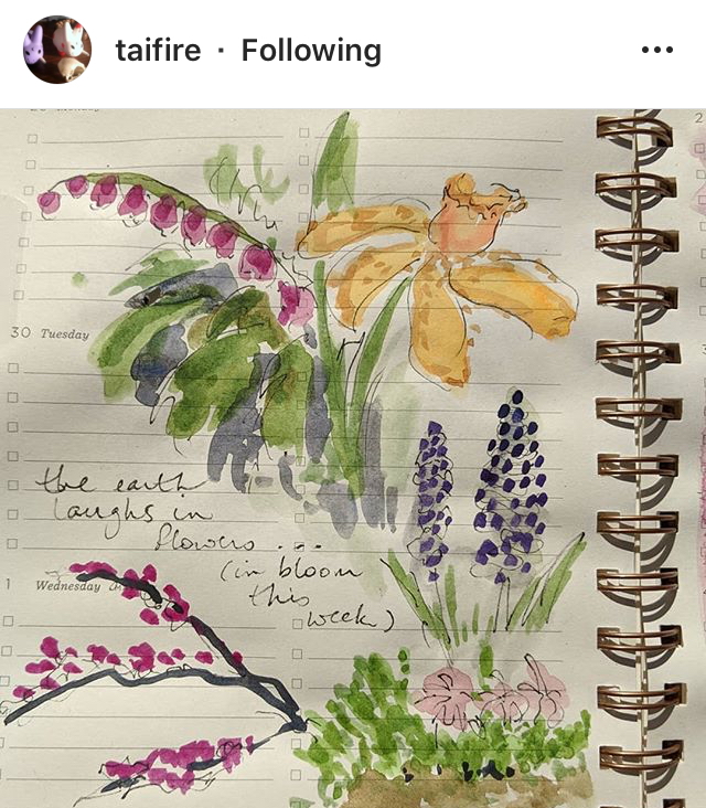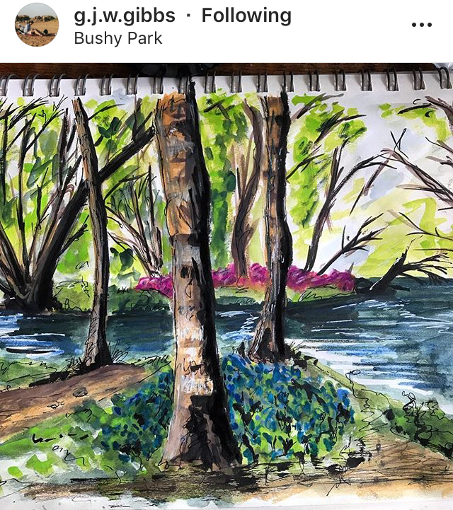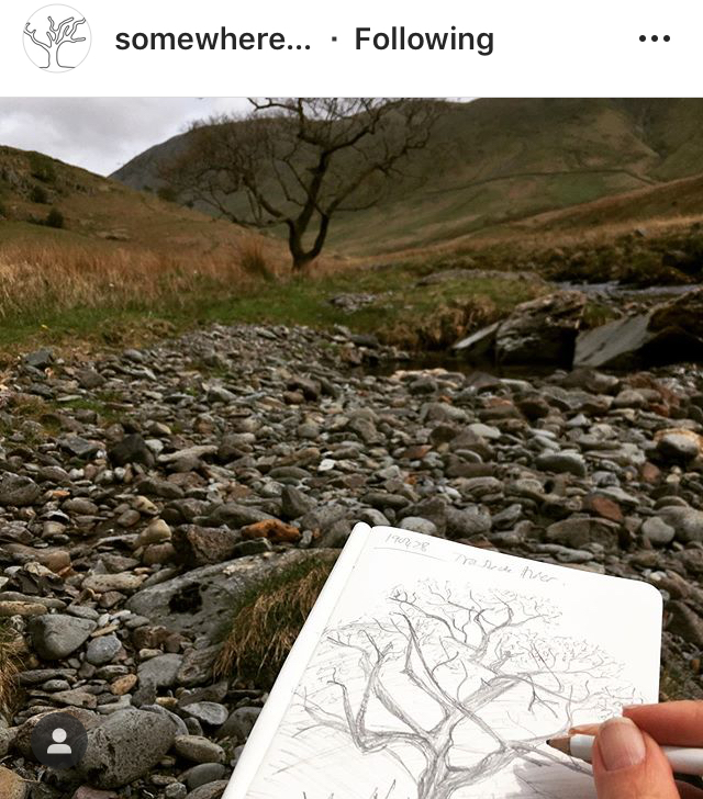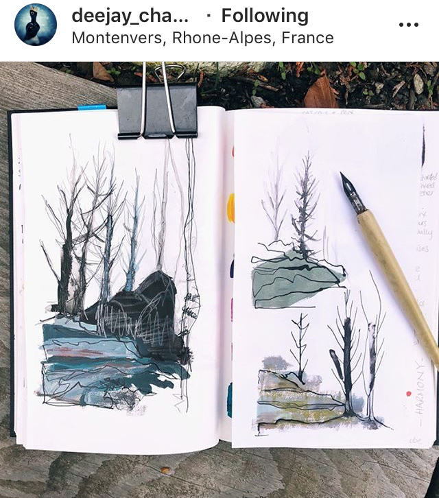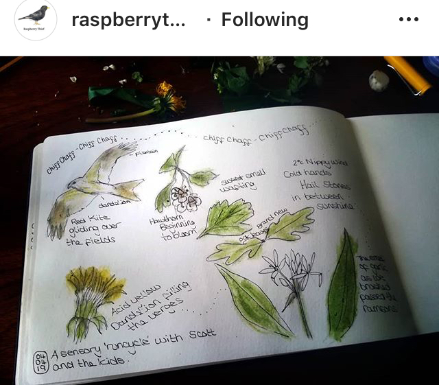 In France, Deryn Abraham’s took us up into the Alpes. I loved the coolness in the air, the altitude, experiencing being high up to capture the view of the rocks and trees. The sense of adventure, but richness of the sense of place. Also from France in Saint-Bonnet-Elvert, @woodlandinspiration joined us to sketch the spring flowers and view, to the Spring sound we look out for, of the cuckoo. Whilst @mirglis Sarah Van Der Linder shared the sunset, together with a video of the sounds whilst there. It was so beautiful and atmospheric.