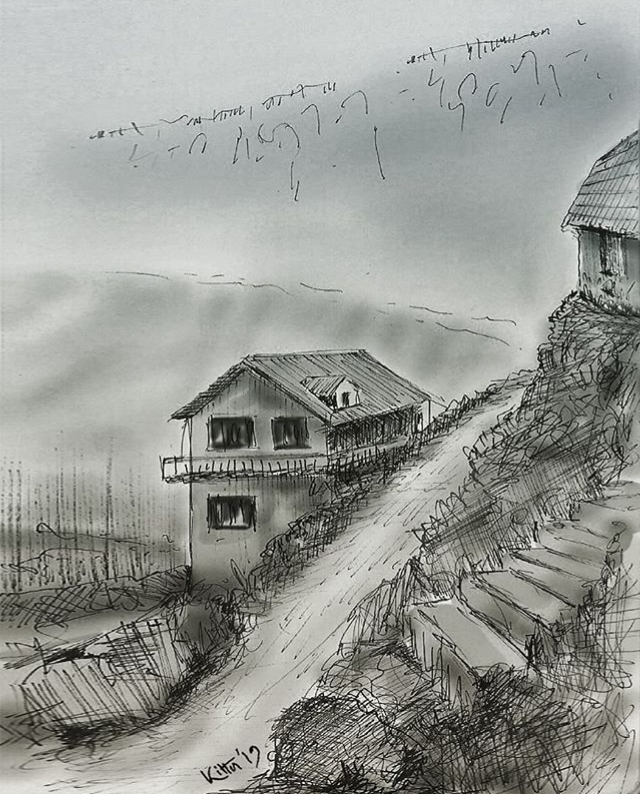 Ramma, a tiny village in the lap of the Himalaya, sketched by Kittu Paul.