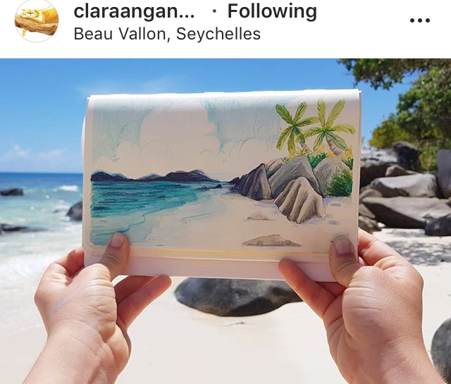 I found it so compelling that some folk joining in submitted more than one sketch, something I didn’t think would happen, but super pleased that you did. From the Himalayas, I found myself stepping onto the beach with the water lapping at my feet in The Seychelles, thanks to Clara Anganuzzi, who brought us her view. After enjoying the beach I was in a quiet spot in Covent Garden, a nook with a horse statue view, which Tom Napper had managed to find. The busy streets are challenging for most whilst sketching, but he said, “Turns out there are quiet spots for drawing all over the place if you keep your eyes peeled. “