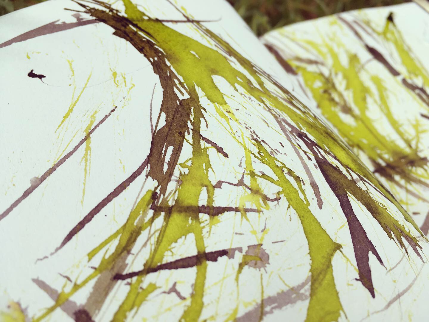 Mark-making with grass and a larch twig and needles using Herbin inks by Katherine Owen