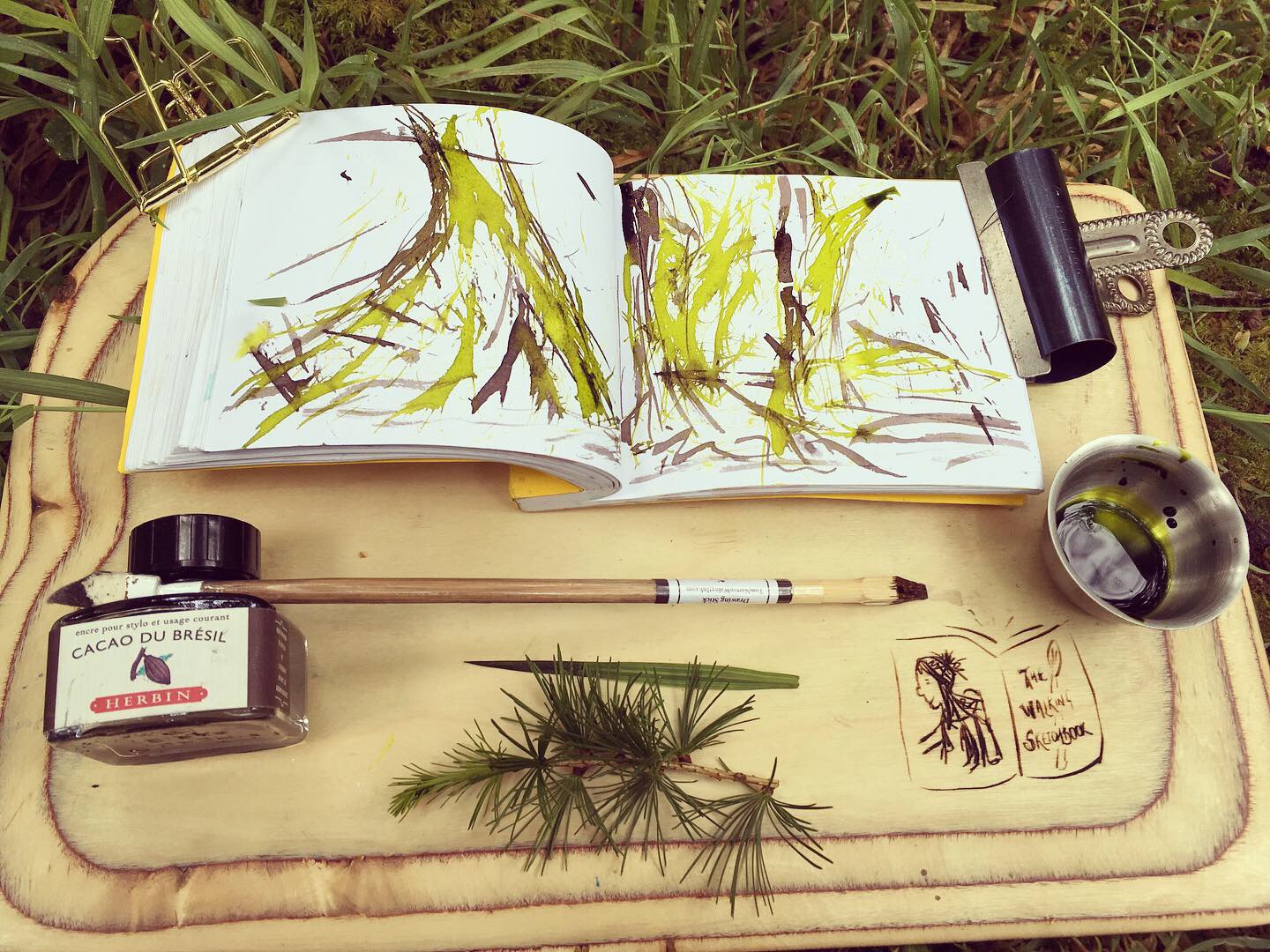 Nestled under two oaks trees, up on the platform above the pool, @beadoodlebug sketched the trees above trying out some walnut ink, sketched with an oak twig, and the wispy green grasses sketched with the larch twig and needles. We commented on how engaging it was to mark-make with nature itself. Such a strong connected feeling to create a sense of place with what we discover. It was more like creative play and experimenting. Such fun!