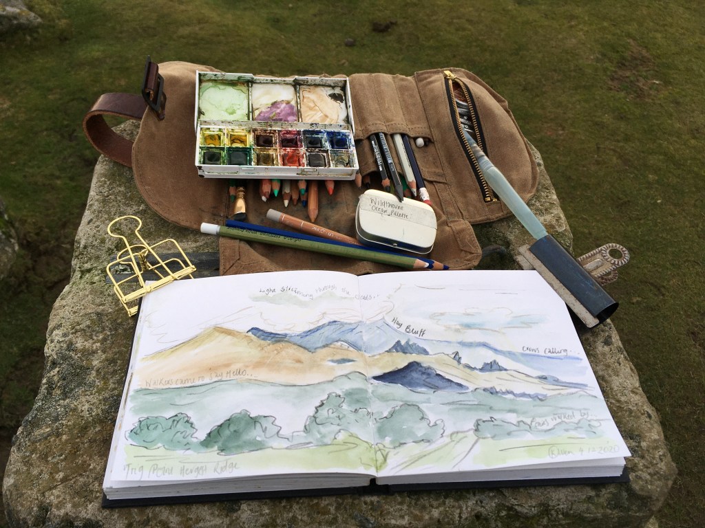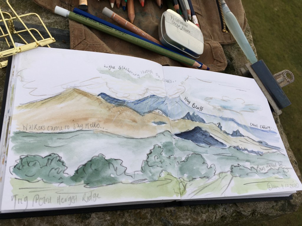 I had walkers coming up to me today to see what I was up to, both interested in art but not tried sketching outside. I chatted about materials I use and how sketching outside made me feel more connected to where I had walked. You feel like you are taking a piece of the landscape away with you in your sketchbook. Some of my materials I recommended to walkers today included: