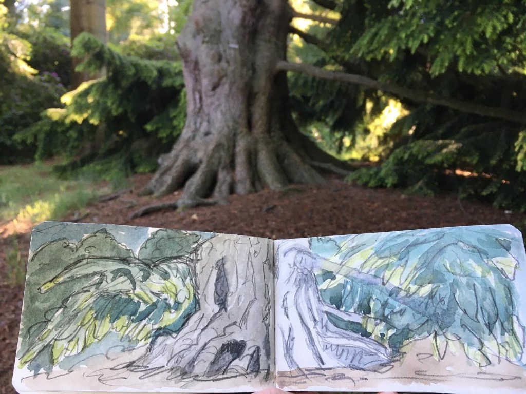 This is one of my favourite sketch adventures, I had such a lovely connection with this tree planted in 1898, making it 122 years old. What an incredible tree standing here looking at me. I nestled against another trunk, to made sure it made it onto my sketchbook page.